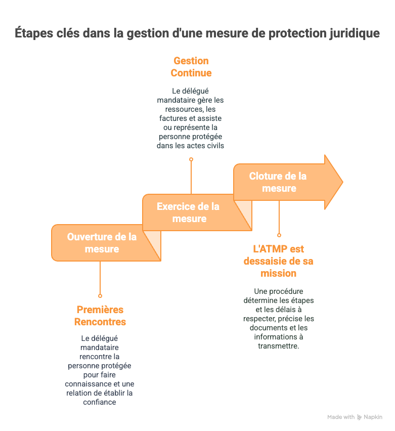 La mesure prend fin en cas de mainlevée (retour à la pleine capacité juridique), de décès, de transfert (la mesure existe toujours mais est confiée à un autre tuteur ou curateur).