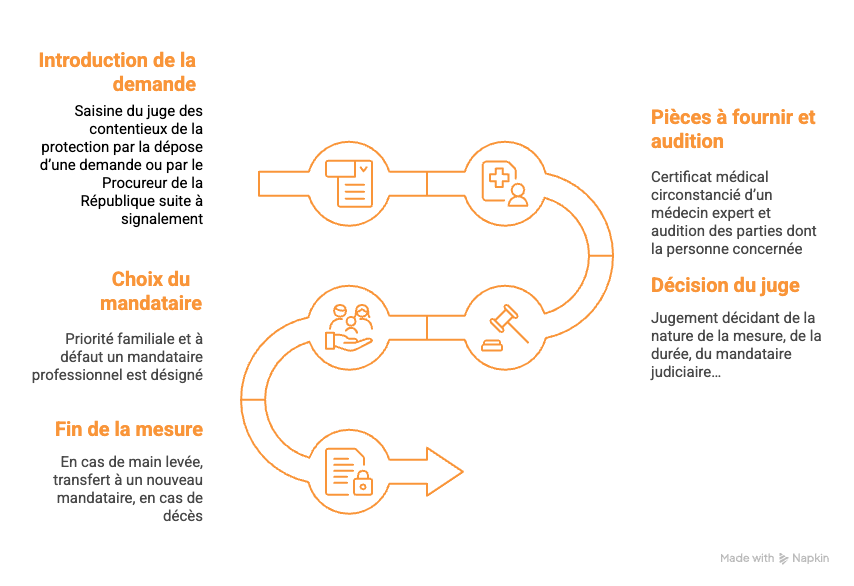 La procédure commence par une demande de mise sous protection auprès du juge des contentieux de la protection par la personne qu’il y a lieu de protéger, son conjoint, le partenaire avec qui elle a conclu un pacte civil de solidarité ou son concubin, un parent ou un allié, une personne entretenant avec le majeur des liens étroits et stables ou la personne qui exerce à son égard une mesure de protection juridique.